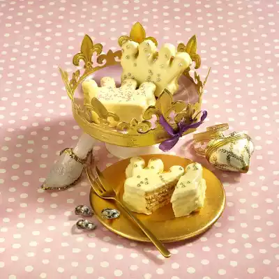 Spread 24 crowns with raspberry jam. Put 3 crowns on top of each other. Finish with the remaining (uncoated) crowns and press them down a little. Place all stacks of crowns on a tray and cover with foil. Weigh down with a marble slab or books and leave to stand for about 2 hours. Roughly chop the chocolate coating. Melt the couverture and coconut oil in a warm water bath. Cover the crown with couverture and decorate with sugar pearls
