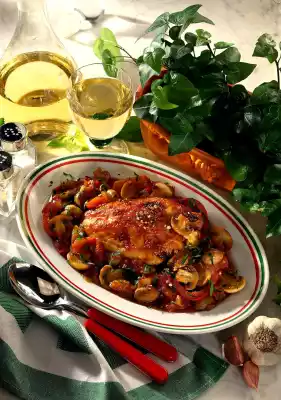 Fry in hot oil until golden brown. Fry the garlic and onions briefly in the cooking fat. Deglaze with wine. Fill vegetables and chicken with the liquid into an ovenproof dish. Pour on 1/2 litre of water.