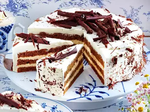 For the chocolate rolls, chop the couverture and carefully melt over a warm water bath. Spread the chocolate thinly on a board or upside-down baking tray. Leave to solidify in a cool place. Use a spatula to scrape off the rolls. Whip 350 g cream until stiff. Remove the cake from the ring and spread the cream all around. Decorate with the chocolate rolls