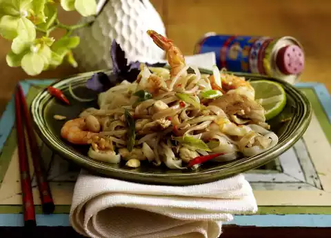Stir-fry for about 5 minutes. Add prawns, dissolved tamarin, soy sauce and fish sauce and simmer briefly. Season to taste with salt, sugar and pepper. Arrange everything on preheated plates, sprinkle with peanuts and garnish with lime slices and basil.