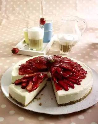 Then stir into the remaining cream and fold in the cream. Finally fold in the strawberries. Spread the mixture on the cake base and smooth it down. Put the cake in a cool place for at least 3-4 hours (but preferably overnight). Wash the remaining strawberries (500 g), drain well and clean. Cut the strawberries into cubes. Mix the cake glaze gradually with 200 ml cold water in a saucepan. Add strawberry jelly and bring to the boil while stirring. Mix cake glaze and strawberries and spread on the cake. Chill the cake for another 1-2 hours. Cut cake into pieces and decorate with mint