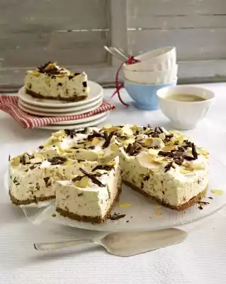Soak gelatine in cold water. Coarsely chop the almonds and roast them in a pan without fat. Remove from the pan immediately and allow to cool (approx. 15 minutes). Coarsely chop 100 g chocolate. Whip cream until stiff and chill. Mix cream cheese, yoghurt, honey, sugar and vanillin sugar to a smooth cream. Squeeze out the gelatine, dissolve and stir in 1-2 tbsp. cream. Stir the gelatine mixture into the remaining cream. Then immediately fold in the cream first, then the almonds and chocolate. Pour the cream onto the crumb base and spread it out slightly wavy. Cover the cake and chill overnight