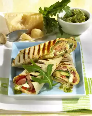 Piadina is a kind of Italian wrap. The thin flat bread is usually warmed up in the oven, filled and eaten warm immediately. If you do not have a contact grill, warm the tortillas beforehand according to the instructions on the package