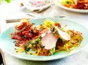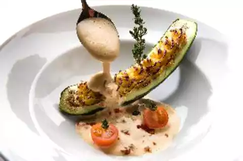 Dresser: Arrange the zucchini au gratin on preheated (pasta) plates and nap the tomato sabayon. Use halved cherry tomatoes and twigs of thyme to garnish.