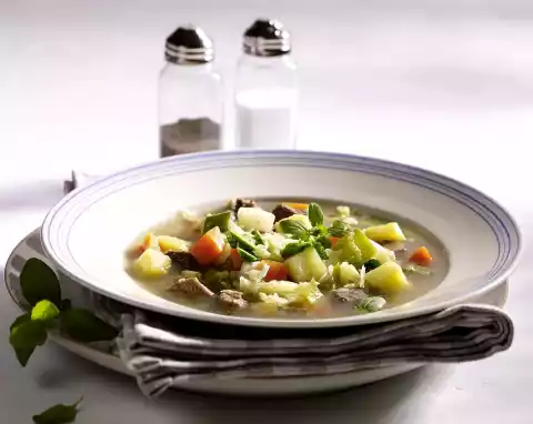 Remove meat from the bone and dice. Cook with the uncooked vegetables in the broth for about 30 minutes. Season with salt and pepper.