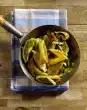 Peel, wash and roughly dice the carrots, parsley root and celery. Halve the onion, roast the cut surfaces in a pan until dark brown. Peel garlic. Add 1/3 of the vegetables, onion, bay leaf, peppercorns and garlic to the stock.