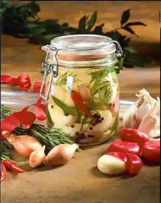 Remove paper and wax layer from cheese. Peel shallots and garlic. Cut garlic into thin slices. Wash rosemary, bay leaf and chilli peppers and dab dry well.