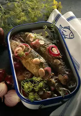 Wash herrings thoroughly under cold running water and dab dry. Mix flour and a little salt on a plate. Roll herrings in it. Heat the fat in portions in a pan and fry the herrings in portions for 5-6 minutes on each side. For the broth, clean, wash and cut the horseradish into fine slices. Bring to the boil together with the vinegar, 180 ml water, pepper and mustard seeds, approx. 2 teaspoons salt, pepper and sugar. Peel onions and cut into thin rings. Add to the hot stock with the plucked dill flowers, bring to the boil again. Leave to stand until the onion rings are soft. Place the fried herrings in a large flat dish and leave to stand for at least 24 hours