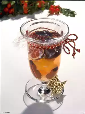 Boil 100 ml water, sugar and drain. Peel the orange so that the white skin is completely removed. Remove the fillets from the parting skins. Wash and halve figs. Wash and sort cranberries. Mix oranges, figs, cranberries, cinnamon, anise stars, dried orange peel and sugar syrup, pour vodka over them. Cut stars from orange slices as desired. Pour into glasses and add vodka and fruits