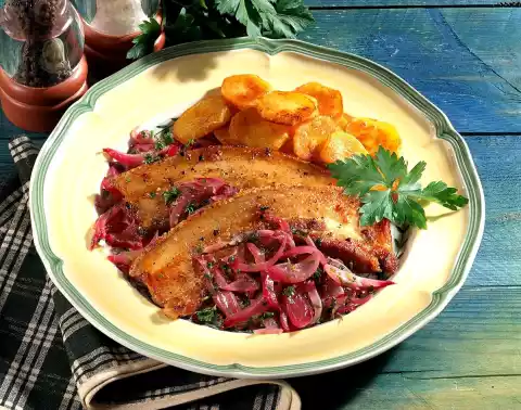 Season to taste with salt and pepper. Keep onion vegetables warm. Remove the meat from the marinade and wipe off the oil. Season belly slices with salt. Heat clarified butter and fry meat on both sides until crispy. Arrange meat and onion vegetables on a plate. Garnish with parsley. Fried potatoes taste good with it