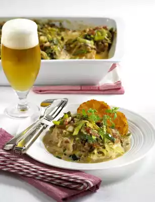 Clean, wash and cut the leek into rings. Spread on the mushroom mass. Mix crème fraîche, cream and hunter's sauce with the whisk of the hand mixer until smooth and pour over the mixture. Cover and chill for about 24 hours. The next day, cook in the preheated oven (electric cooker: 175 °C/ circulating air: 150 °C/ gas: level 2) for 50-60 minutes. Garnish with parsley and tomatoes. Delicious with fresh farmhouse bread