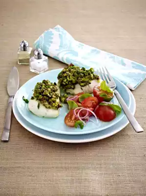 Wash the fish and dab dry. Bring the broth to a boil in a pot. Add the fish and let it simmer in a closed saucepan in lightly boiling broth for about 3 minutes. Remove and place on a baking tray lined with baking paper. Keep fish stock warm. Spread the pistachio crust on the fish.