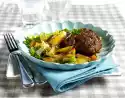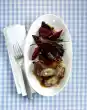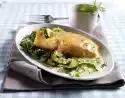 In the meantime, wash the fish, pat dry and season with salt. Cut the skin several times. Heat 1 tsp. oil in a small, coated pan. Place the fish in the pan with the skin side down and fry over high heat for about 4 minutes. Turn the fish over and cook over low heat for 1-2 minutes. Arrange the ragweed and fish fillet, garnish with marjoram if desired