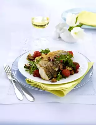 In the meantime, heat 2-3 tablespoons of oil in a large pan and fry the fish for 2-3 minutes on each side. Mix the rocket with the vegetables, season again with salt and pepper. Arrange vegetables and fish on plates. Delicious with baguette