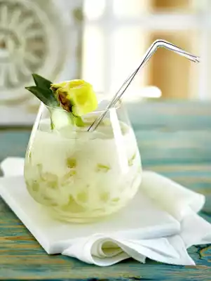 Shake the rum, pineapple juice, coconut cream, cream and ice cubes vigorously and pour into a glass. Garnish with pineapple and straw if desired.