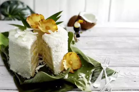 Remove the cake from the pan and cut horizontally three times. Spread the bottom layer with approx. 1⁄5 cream and spread 1⁄3 pineapple on top. Spread 2 more cake layers like this. Place the top cake layer on top with the cut surface facing down and press down carefully.