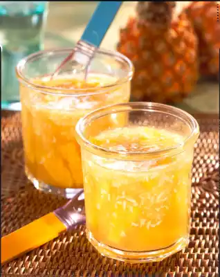 Peel the pineapple, remove the stalk, cut the fruit into eighths and slice. Put pineapple juice, coconut liqueur and jam sugar in a pot and heat while stirring. Let it boil fizzy for at least 3 minutes. Add grated coconut and pineapple pieces and mix in. Pour into glasses and let cool off. Cover and place in the refrigerator. Consume as soon as possible