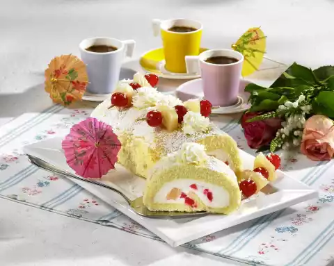 Spread the chopped cherries and pineapple pieces evenly on top. Roll up the sponge cake from the long side and refrigerate for about 1 hour. Whip the cream until stiff, while pouring in 1 sachet of vanilla sugar. Sprinkle sponge roll with icing sugar and grated coconut. Pour cream into a piping bag with a star nozzle and spray tuffs onto the roll. Put the remaining cherries and pineapple pieces alternately on wooden skewers and decorate the roll with them