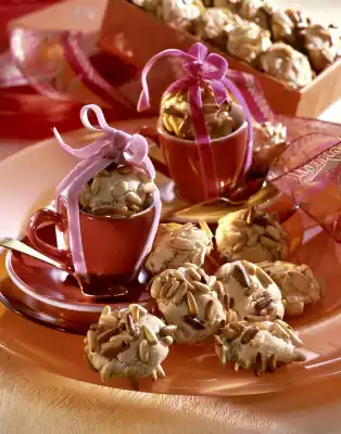 Whisk the egg yolk and cream. Form walnut-sized balls from the dough. Turn 2/3 of the balls first in whisked egg yolk, then in pine nuts (if necessary press them down a little). Turn the remaining balls in egg yolk and then in flaked almonds.