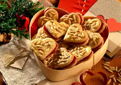 Knead the flour, sugar, vanilla sugar, salt, cold fat in flakes, bitter almond oil, ground pine nuts and egg yolks into a short pastry. Cover the dough and let it rest in the refrigerator for about 1 hour. Roll out the dough on a floured work surface 3-4 mm thick. Cut out hearts (approx. 5 cm Ø). Spread half of the hearts with egg white and sprinkle with pine nuts. Bake the hearts in a preheated oven (electric: 175 °C/ gas: level 2) for approx. 14 minutes. Let them cool down. Then spread the uncoated hearts with rosehip jam and place a "pine heart" on top. Results in about 20 filled biscuits