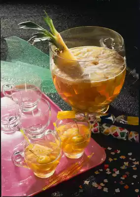 Cut the pineapple in half and, except for a gap for decoration, peel and dice the flesh. Drain the cherry apples. Put the pineapple and apples in a punch bowl, pour Calvados over them and let them steep for about 30 minutes. Fill up with wine. Add well chilled cider just before serving. Serve decorated with the pineapple wedge