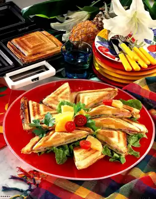 Lightly coat the preheated sandwich toaster with oil and place 2 sandwiches inside. Close the lid and bake in about 2 minutes until golden brown. Bake the remaining sandwiches in the same way and cut them in half diagonally. Arrange on a plate together with salad. Serve garnished with cherry tomatoes, remaining pineapple slices and parsley