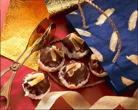 Melt the chocolate coating in a hot water bath. Dip macaroon tips into the chocolate coating. Decorate with pineapple. Let the chocolate coating dry. Makes about 50 pieces.