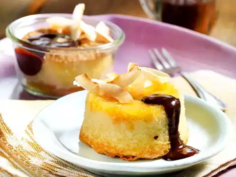 Grease six preserving jars or ovenproof moulds (each with a capacity of approx. 1⁄4 l) and sprinkle with 2 tablespoons of sugar. Place 1 pineapple slice in each glass. Preheat oven (electric cooker: 175 °C/circulating air: 150 °C/gas: level 2).