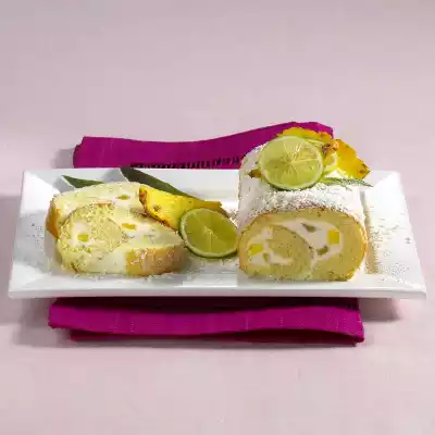 Add the pineapple and simmer for 5 minutes. Let it cool down. Soak gelatine in cold water. Drain the pineapple and collect the syrup. Mix quark, collected syrup, lime juice and lime zest. Dissolve gelatine, stir into the cream. Chill until the cream begins to gel. Whip cream until stiff, fold pineapple pieces and cream into the gelling cream. Spread the pineapple cream on the sponge cake plate, roll up with the help of the tea towel. Chill for about 2 hours. Sprinkle the sponge roll with coconut flakes and dust with icing sugar. Decorate with lime slices, pineapple slices and leaves