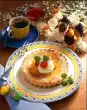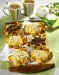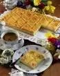Cover after approx. 30 minutes if necessary. Let cool off. Cut the cake into pieces. Whip cream until stiff. Dab the cake with cream and decorate as you like with pistachios, cherries, pineapple, lemon balm and sugar flowers. Results in about 30 pieces