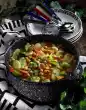 Peel and thinly slice the pineapple. Cut out the stalk from the middle. Brush a coated pan with oil and heat it up. Fry the pineapple in portions on both sides. Remove, arrange on a plate and cover with ham. Sprinkle with pink berries and garnish with balm