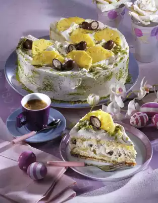 Spread the shortcrust pastry base with pineapple jam. Place the first sponge cake base on top. Cover with a cake ring. Spread the pineapple-chocolate cream on the sponge cake base and smooth it down. Cover with the second sponge cake base and refrigerate for about 1 hour. Whip the cream until stiff. Loosen the cake ring, spread the cream loosely all around the cake. Decorate with remaining chocolate candies, baby pineapple and pistachios