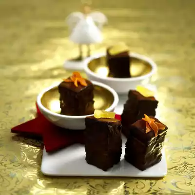Carefully cut the sponge cake into about 40 cubes (approx. 3 x 3 cm). Place the cubes on a cake rack and cover them completely with the chocolate coating and leave to cool for 10 minutes. Cut the rest of the pineapple into 28 small pieces. Cut mango into approx. 36 very thin strips. dust the cubes with cocoa, decorate with pineapple and mango and let dry