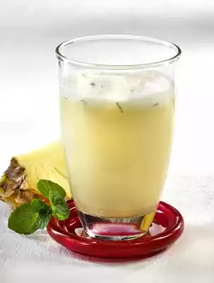 Peel the pineapple, remove the hard stalk. Cut flesh into small pieces. Add lime juice, coconut milk and grated coconut and puree. Fill up with grapefruit juice. Chop mint finely, stir in