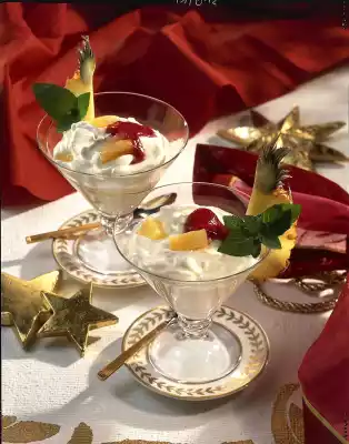 Pour cream into four dessert glasses. Serve with the pineapple pieces and some raspberry sauce. Serve decorated with mint and baby pineapple as desired. Serve with the rest of the raspberry sauce separately.