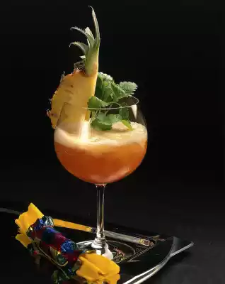 Peel the pineapple and cut out the stalk. Dice the flesh and puree it with the cutting stick of the hand mixer. Let it freeze a little in the freezer. Cut baby pineapples into eighths and put a slit in each case on a bulbous glass.