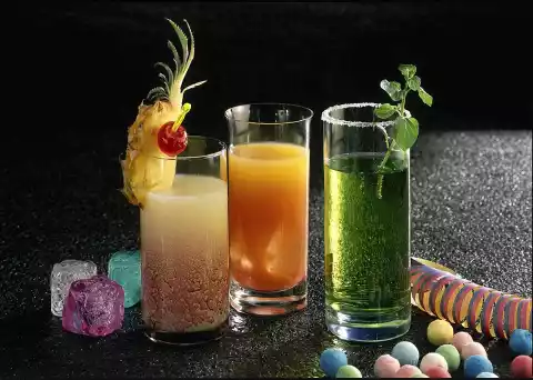 Mix rum and liqueur. Fill up with juice. Decorate with cherries and pineapple.