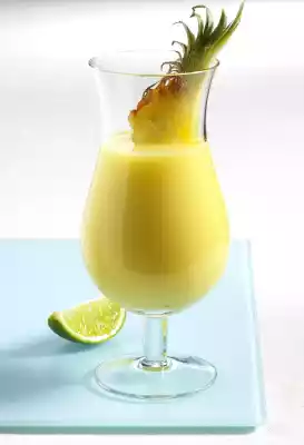 Pour the drink into a glass, decorate with the pineapple skewer and the lime corner. Consume immediately as it quickly becomes bitter.