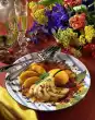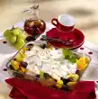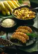 Arrange staggered on the dish. Cover with the prepared ingredients. Spike with wooden skewers. Garnish with dill and chervil. Garnish with chilli dip and chillies.