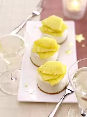 Whip the cream until stiff and carefully fold into the almond cream. Fill the cream into dessert rings (approx. 5 cm Ø), smooth it down and put it in a cool place for approx. 4 hours. Peel and quarter the pineapple and remove the stalk.