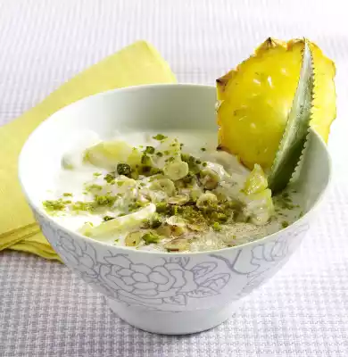 Cut off 1 thin slice of pineapple. Peel the rest of the pineapple, quarter it and cut it into slices. Mix yoghurt and sugar. Fold in pineapple. Arrange in bowls. Sprinkle with hazelnut slices and pistachio.
