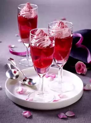 Whip the cream and food colouring with the whisk of the hand mixer. Pour into a piping bag with star-shaped spout and squirt onto the jelly as tuffs. Decorate with raspberry sugar.