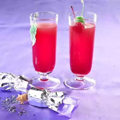 Put the cherry liqueur, gin, orange juice, coconut liqueur and grenadine in a blender and mix. Put 2 ice cubes in a narrow tall glass. Spread the mixture over the glasses and fill up with tonic. Serve decorated with sweetened cocktail cherries and leaves