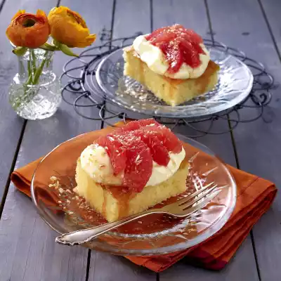 Cut the cake into pieces on the tray. Spread the cream on the pieces. Cover with grapefruit fillets and sprinkle with coconut flakes. Sprinkle with remaining syrup before serving