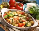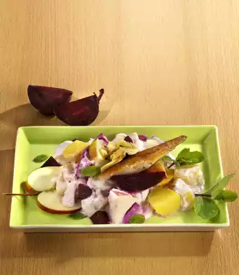 Chop nuts coarsely. Mix all prepared ingredients. For the marinade, mix egg yolk, mustard, salt, vinegar, stock, sour cream and yoghurt until creamy and mix with the potato salad. Wash the parsley, dab dry and chop finely. Arrange the pink potato salad together with the smoked mackerel and the beetroot cut into slices. Sprinkle with the parsley