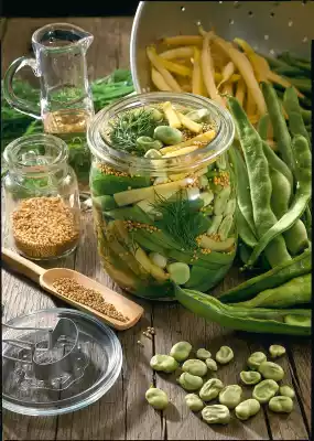 Break or cut the wax, sliced and broken beans into pieces about 5 cm long. Pluck off dill flags. Layer all beans, dill and mustard seeds in prepared glasses. Press on firmly. Fill up vinegar-essence with water to 1 3/4 litre. Add 1/2 teaspoonful each of salt and sugar and bring to the boil. Fill up beans with the brew to about 2 cm below the rim. Close glasses well. Fill the fat pan of the oven about 1 cm high with hot water. Place glasses on top so that they do not touch each other. Put them into the preheated oven (electric cooker: 150 °C/ circulating air: 125 °C/ gas: level 1). After about 1 hour the liquid in the glasses starts to bubble. Sterilize for another 1 1/2 hours from this point. Remove and let the glasses cool down