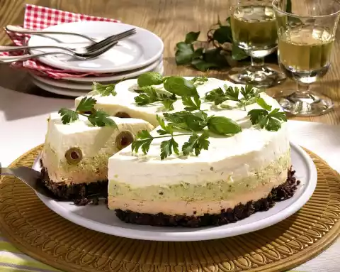 Mix pesto and 1/4 of the cream cheese mixture, season with salt, spread on the red cheese mixture and smooth it down. Chill for about 30 minutes. Drain the olives. Season half of the cream cheese mixture with salt. Spread a thin layer on the green cheese. Spread the olives on top and press in a little. Add the rest of the cream cheese mixture and carefully smooth it down. Chill the cake for at least 3 hours. Use a hot rinsed knife blade to remove the cake from the edge of the springform pan, remove the edge. Place the cake on a cake plate. Rinse the herbs, dab dry and place on the cake