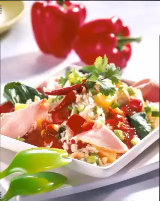 Season the rice salad to taste again. Arrange the turkey breast on salad leaves if necessary and garnish. Coarsely chop the peanuts and sprinkle over them