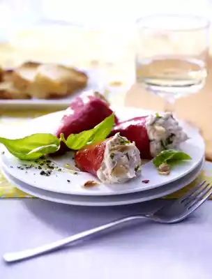 2 Gently drain the piquillos, pat them dry on paper towels. Then garnish them with sardine stuffing. Thinning out and chisel the basil (reserve a few feathers).