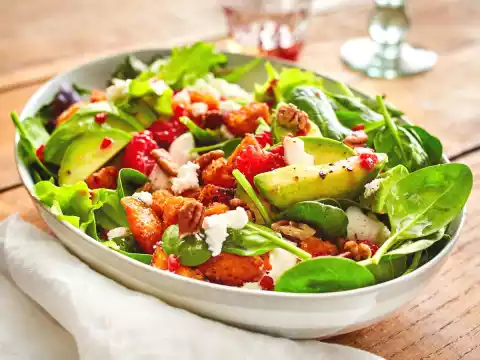 Sort the spinach and salad, wash and shake dry. Halve the avocado, remove the stone, remove the flesh from the skin and cut into slices. Peel and wash sweet potato, cut into cubes of about 1 cm.